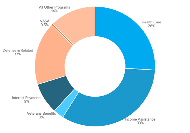 Η κυβέρνηση των Ηνωμένων Πολιτειών δαπάνησε περίπου 4,5 τρισεκατομμύρια δολάρια το οικονομικό έτος 2019, από τα οποία μόλις το 0,5% (22,6 δισεκατομμύρια δολάρια) δόθηκαν στη NASA. Στο γράφημα αυτό, οι αποχρώσεις του μπλε αντιπροσωπεύουν υποχρεωτικά προγράμματα δαπανών. Οι αποχρώσεις του πορτοκαλί είναι προαιρετικά προγράμματα που απαιτούν ετήσιες πιστώσεις από το Κογκρέσο. Πηγή: Γραφείο Διαχείρισης και Προϋπολογισμού Ιστορικοί Πίνακες 8.5 και 8.7.